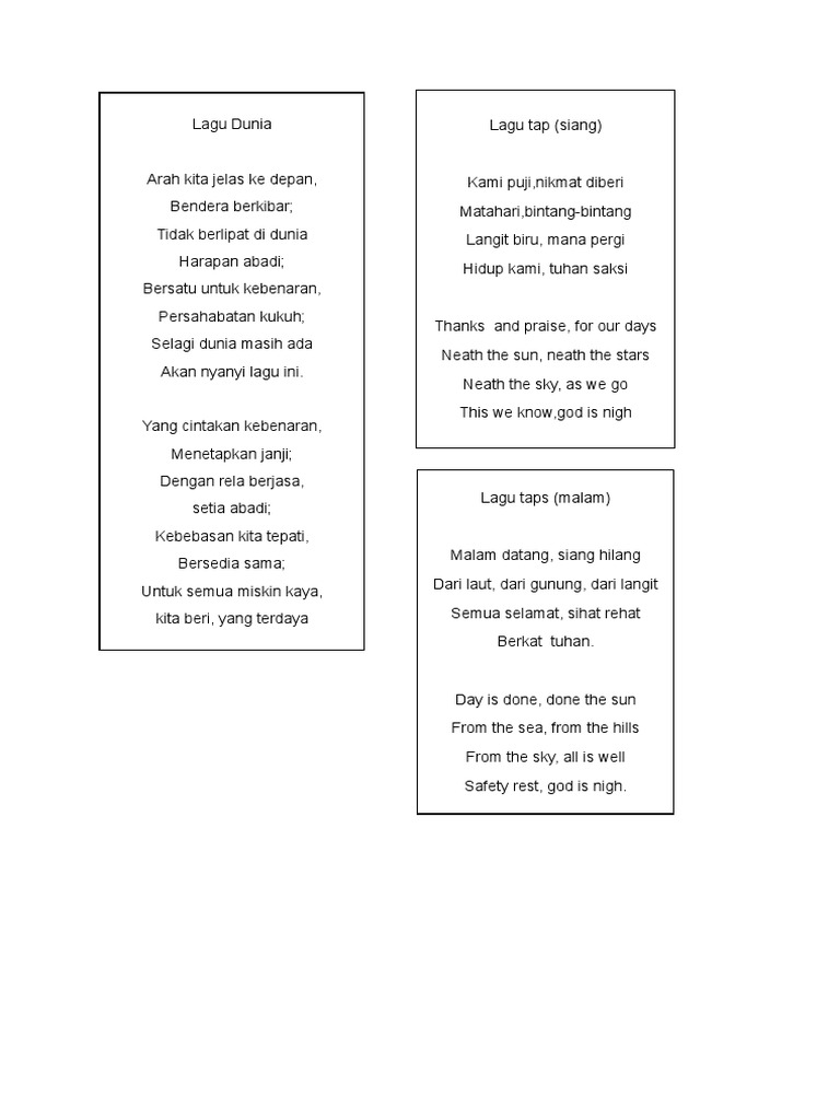Ada bulan ada bintang. Malam datang siang hilang Dari laut dari gunung dari langit Semua selamat sihat rehat Berkat Tuhan TAPS SIANG English. 116 Mengetahui dan menyanyikan Lagu Dunia dan Lagu Taps Siang dan Malam versi Bahasa Melayu dan Bahasa Inggeris LAGU DUNIA Arah kita jelas ke depan Bendera berkibar Tidak berlipat di dunia Harapan abadi.